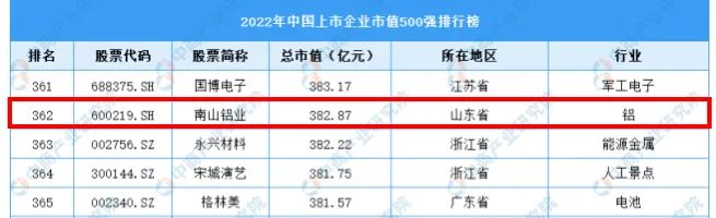 近日,2022年中國(guó)上市企業(yè)市值500強(qiáng)排行榜發(fā)布,南山鋁業(yè)躋身其中,總市值382.87億元,位列第362位。