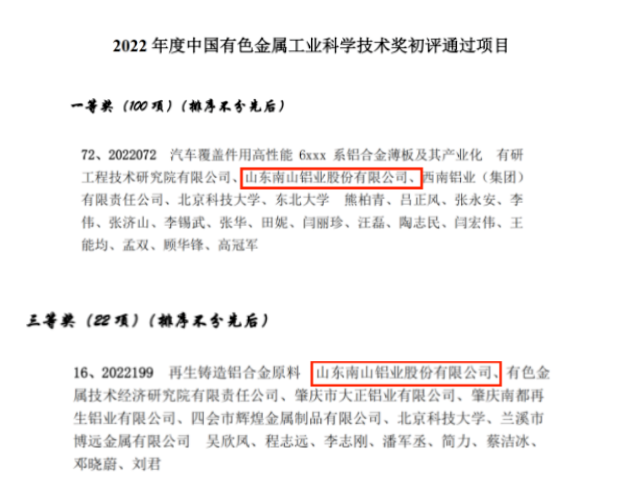 近日,2022年度中國有色金屬工業(yè)科學(xué)技術(shù)獎獲獎名單揭曉,南山鋁業(yè)與有研工程技術(shù)研究院有限公司合作項目《汽車覆蓋件用高性能6xxx系鋁合金薄板及其產(chǎn)業(yè)化》獲一等獎,南山鋁業(yè)主起草標(biāo)準(zhǔn)項目《再生鑄造鋁合金原料》獲三等獎。