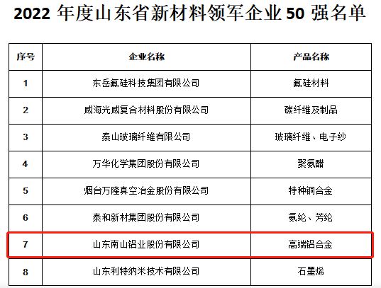 5月19日,山東省工信廳發布《關于公布2022年度山東省新材料領軍企業培育庫入庫名單和50強名單的通知》,確定262家企業為2022年度山東省新材產領軍企業培育庫入庫企業,其中,山東南山鋁業股份有限公司入選2022年度山東省新材料領軍企業培育庫入庫名單,并位列50強前列。