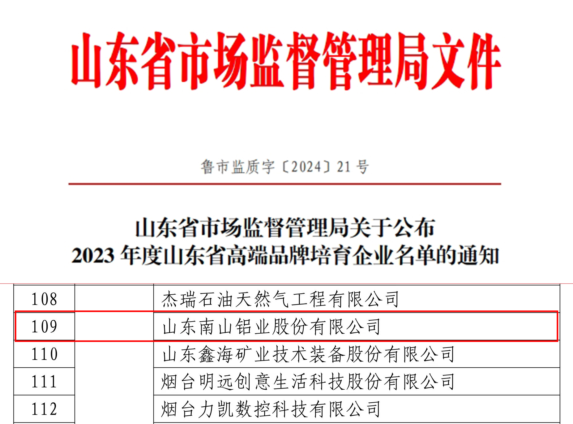 近日,山東省市場監督管理局公布2023年度山東省高端品牌培育企業名單,山東南山鋁業股份有限公司榮譽上榜。