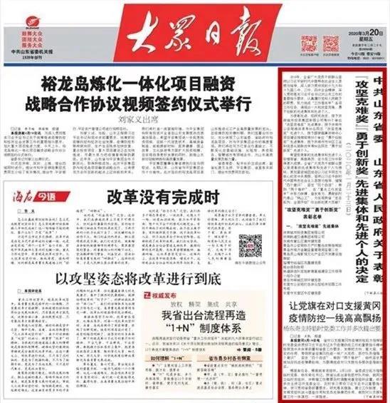 3月20日,《大眾日報》在一版刊發“中共山東省委山東省人民政府關于表彰‘攻堅克難獎’‘勇于創新獎’先進集體和先進個人的決定”。山東裕龍石化項目煙臺推進工作專班獲評“攻堅克難獎”先進集體,山東南山鋁業股份有限公司董事長程仁策獲評“勇于創新獎”先進個人。