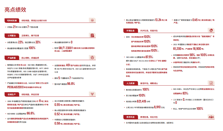 近日,南山鋁業發布了2021年環境、社會及管治(ESG)報告,這是公司參照上海證券交易所相關準則、回應聯合國可持續發展目標及MSCI ESG評級指標所編制的首份ESG報告,也是公司發布的第12份社會責任報告。本次報告依據宏觀政策導向,結合利益相關方的關注和訴求,對標行業優秀企業,開展各類利益相關方訪談,識別出了21項ESG議題和7個重點議題,詳盡闡述了2021年南山鋁業在ESG領域取得的亮眼業績,讓大眾看到了一個落實企業責任、堅守長期主義、可持續發展的南山鋁業。