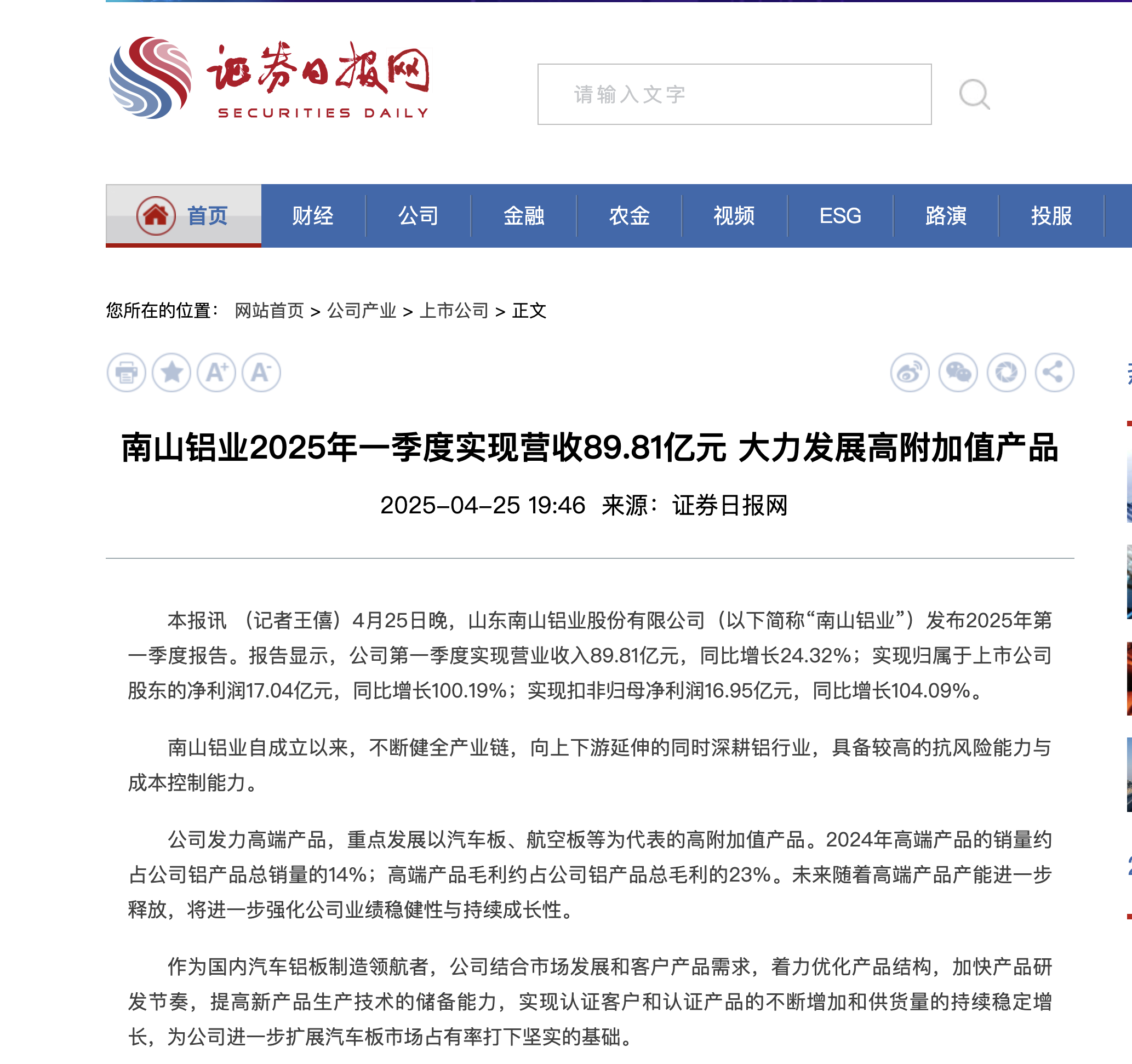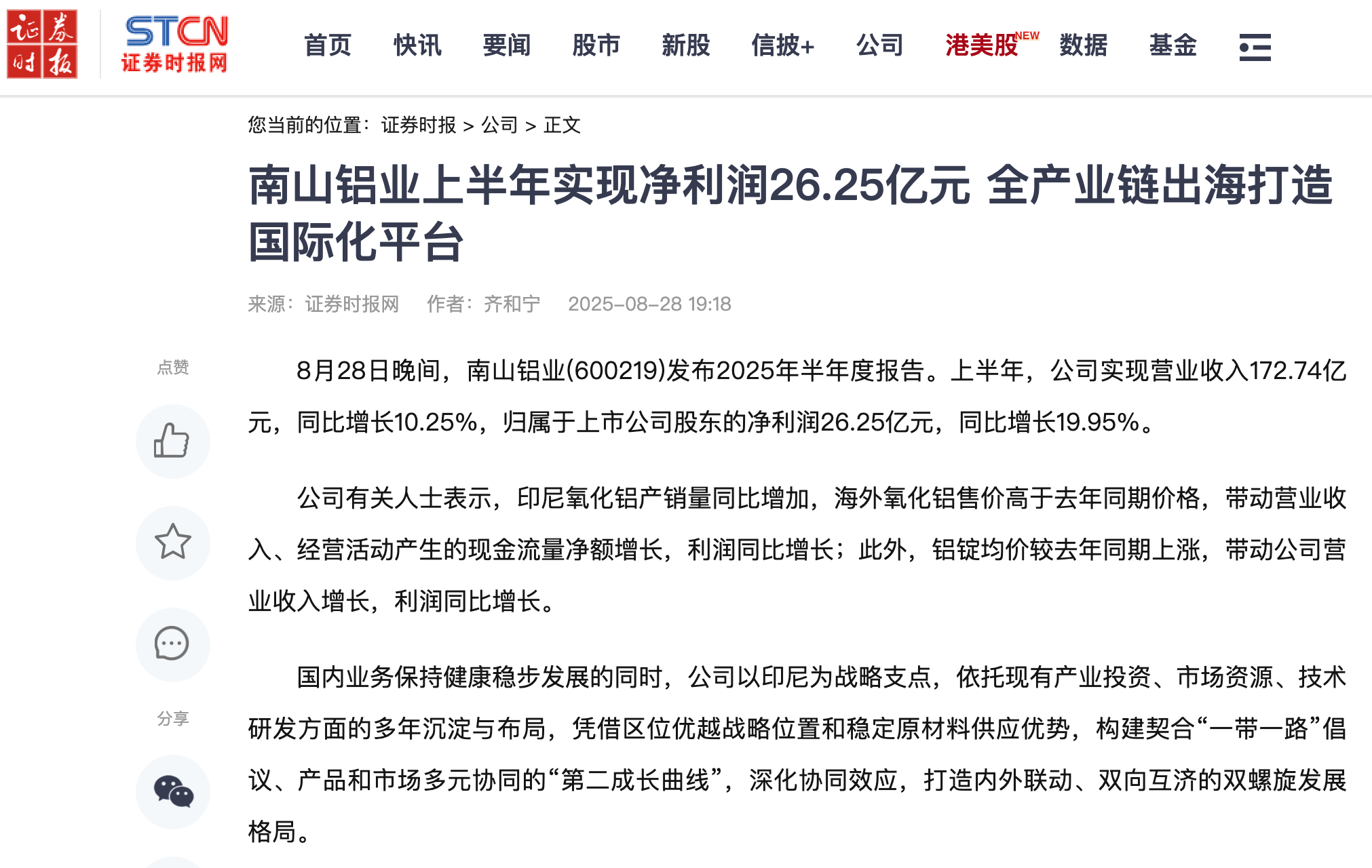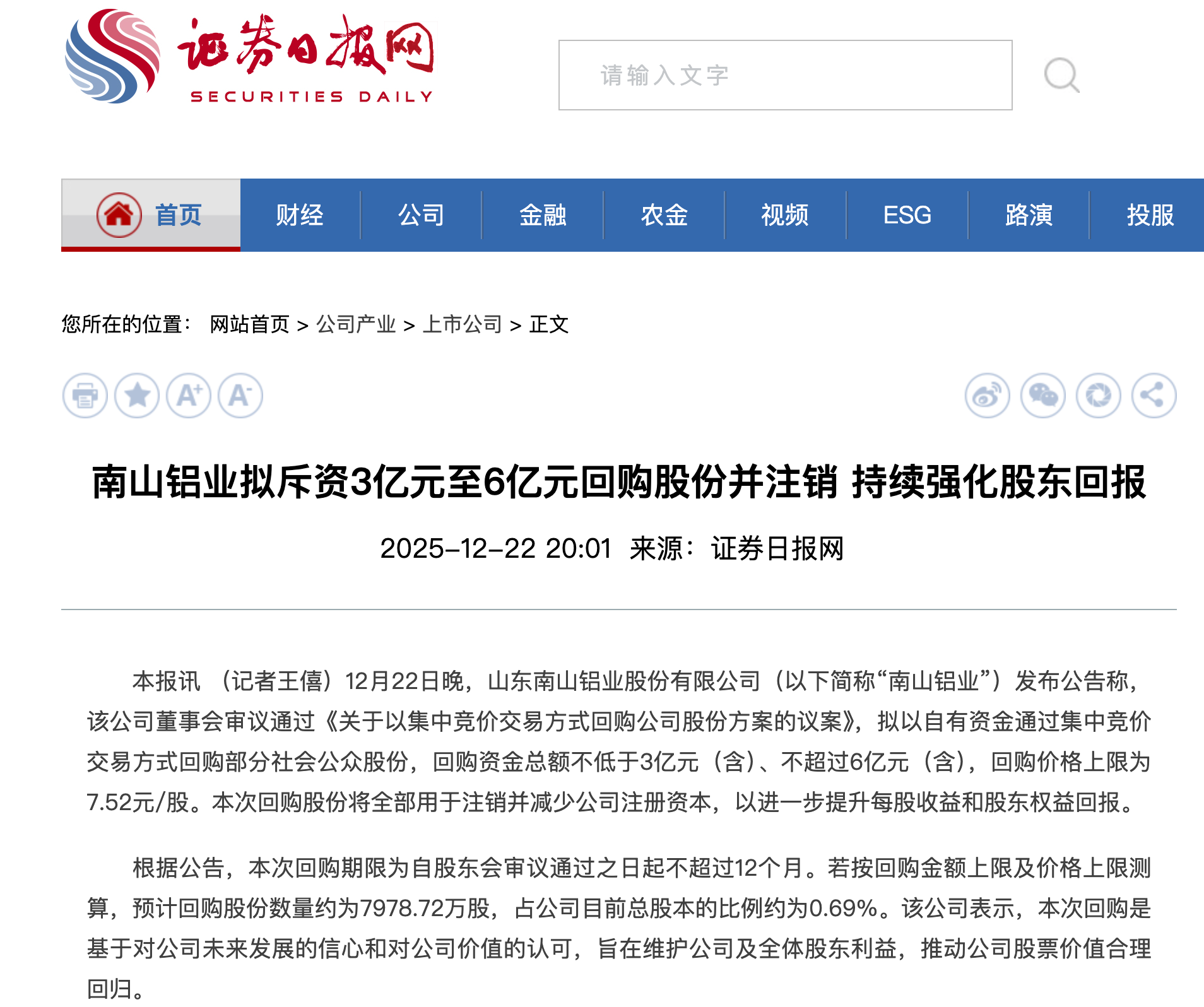 證券日報:南山鋁業擬斥資3億元至6億元回購股份并注銷 持續強化股東回報