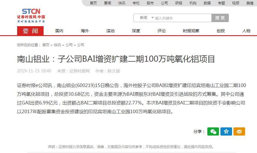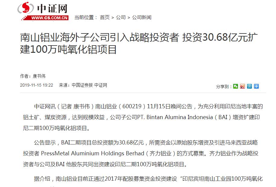 南山鋁業:子公司BAI增資擴建二期100萬噸氧化鋁項目-證券時報